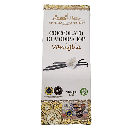 Modica IGP vanilla chocolate Gr100. Minimum cocoa 50%. Ingredients: Cocoa paste, cane sugar, natural vanilla flavouring 0.5%. May contain traces of nuts (pistachios, almonds, hazelnuts, walnuts). GLUTEN FREE