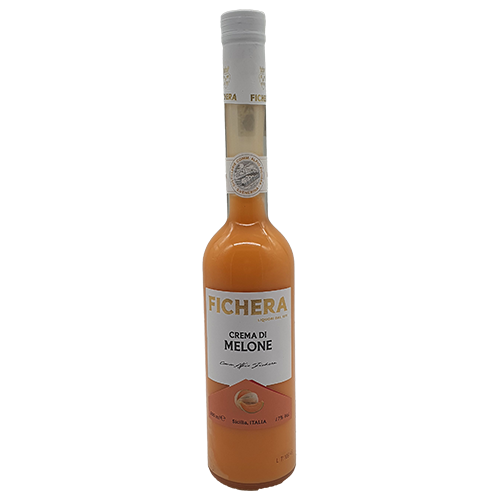 Fichera melon cream ML500. A delicious liqueur cream that originates from the combination of very fresh cream and an alcoholic infusion of sweet cantaloupe melon. Melon cream is an ideal liqueur to be consumed with desserts, but also to enrich sweets, ice creams and fruit salads:
