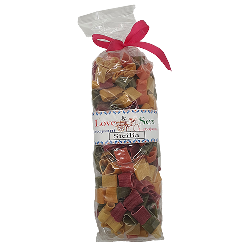 Love & Sex Gr250. Ingredients: durum wheat semolina, dehydrated vegetables in variable proportions 1.5% (chard, spinach, turmeric and tomato)