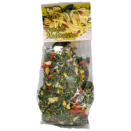 Pasta alla Mediterranea Gr80. Ingredienti: prezzemolo, basilico, aglio, zucchine, peperoncino e sale. Può contenere tracce di cereali contenenti glutine, soia, sedano, senape, semi di sesamo, arachidi, crostacei, derivati del latte, solfiti, anidride solforosa.