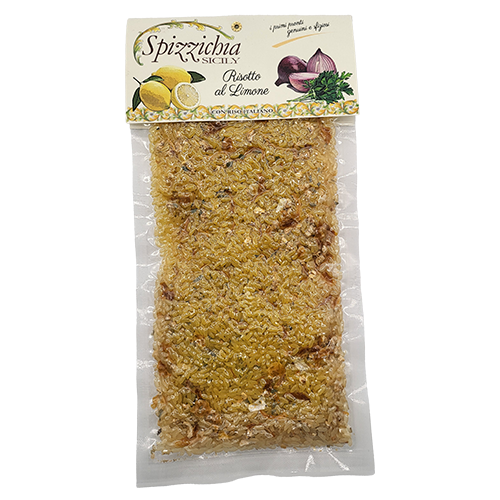 Lemon risotto Gr200. Ingredients: Italian ribeparboiled rice 90%, dehydrated lemon powder, onion, parsley, turmeric, salt, granular broth (potato starch, yeast extract, potato maltodextrin, sunflower oil, ginger, nutmeg, rosemary, cloves, salt). May contain traces of soy.