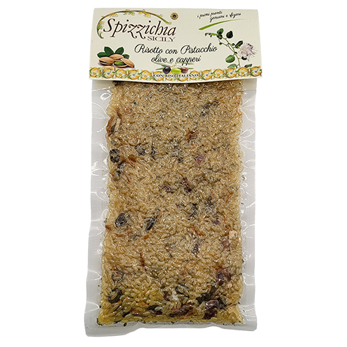 Risotto with pistachio, olives and capers Gr200. Ingredients: Italian parboiled ribe rice 87%, pistachio 5%, dehydrated vegetables (capers, olives, onion, parsley) 5%, salt, turmeric, granular broth (potato starch, yeast extract, potato maltodextrin, sunflower oil, ginger, nutmeg, rosemary, cloves, salt). May contain traces of soy.