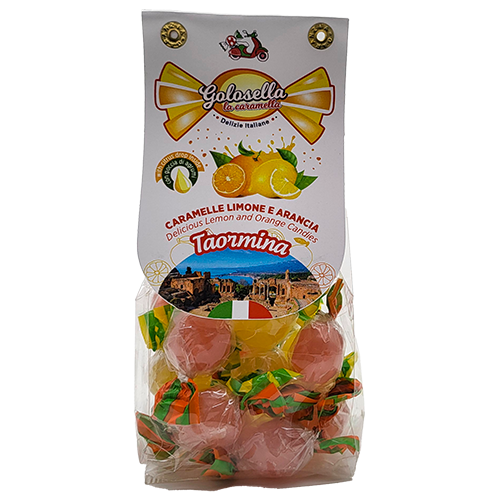 Caramelle limone e arancia Golosella Gr100. Ingredienti: Zucchero, sciroppo di glucosio (mais), destrosio, acidificante: acido citrico, aroma arancia naturale, estratti vegetali: cartamo, aroma naturale di limone, carota nera, ribes nero.