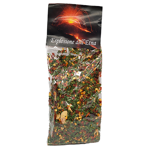 Esplosione dell'Etna Gr80. Ingredienti: peperoncino, aglio, sale e prezzemolo. Può contenere tracce di cereali contenenti glutine, soia, sedano, senape, semi di sesamo, arachidi, crostacei, derivati del latte, solfiti, anidride solforosa.