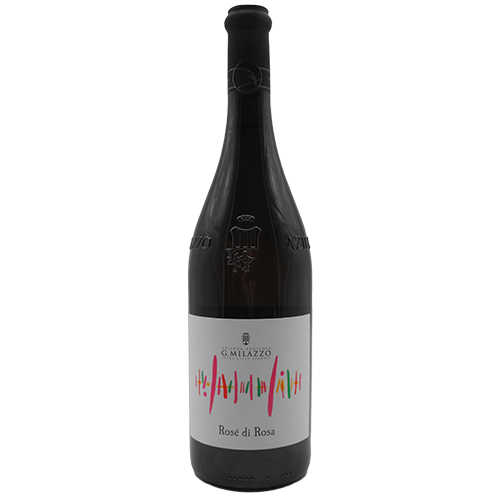 Milazzo rosé di rosa 75cl. Rappresenta il vino frizzante rosato della cantina Milazzo. Si presenta con un colore rosa intenso dai riflessi granati che richiamano il frutto del melograno. All'olfatto, si percepisce un bouquet floreale intenso che si integra armoniosamente con sentori di zagara e agrumi maturi. Al palato, risulta equilibrato, fresco, sapido e al contempo setoso. Il finale è caratterizzato da note fruttate riconducibili al lampone.