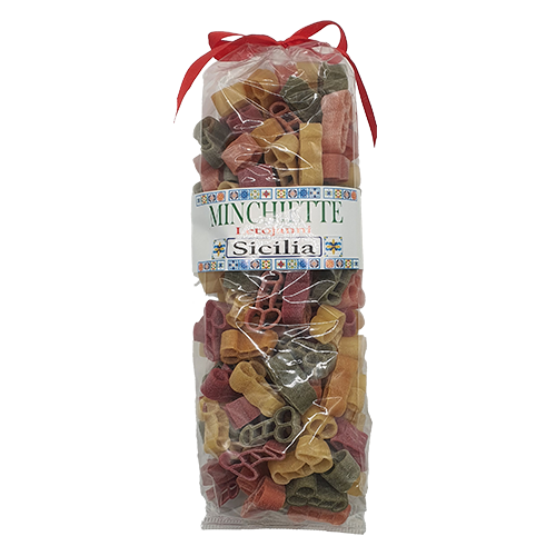 Minchiette Gr250. Ingredienti: semola di grano duro, vegetali disidratati in proporzione variabile 1,5% (bietola, spinaci, curcuma e pomodoro)