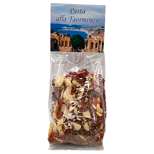 Pasta alla Taorminese Gr80. Ingredienti: pomodoro, aglio, basilico, mandorle e sale. Può contenere tracce di cereali contenenti glutine, soia, sedano, senape, semi di sesamo, arachidi, crostacei, derivati del latte, solfiti, anidride solforosa.