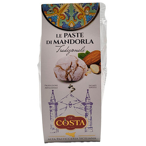 Paste di mandorla tradizionali F.lli Costa Gr120. Ingredienti: Zucchero, mandorle pelate (36%), mandorle amare (2%), albume d'uova, miele, sciroppo di glucosio-fruttosio, conservante: potassio sorbato, aroma naturale.