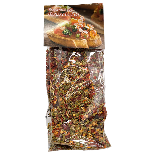 Preparato per bruschetta Gr80. Ingredienti: peperoncino, sale, aglio, pomodoro, origano e basilico. Può contenere tracce di cereali contenenti glutine, soia, sedano, senape, semi di sesamo, arachidi, crostacei, derivati del latte, solfiti, anidride solforosa.